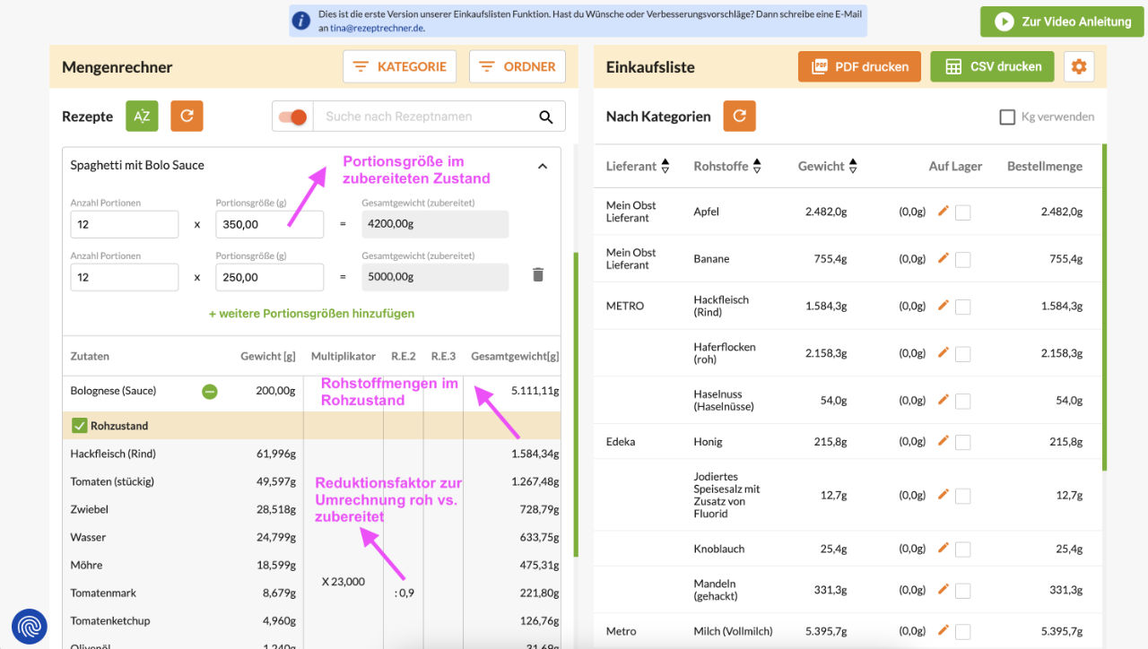 Diese dient der Kalkulation von Mengen und Wareneinsatz für verschiedene Gerichte, Menüs oder größere Catering-Aufträge.